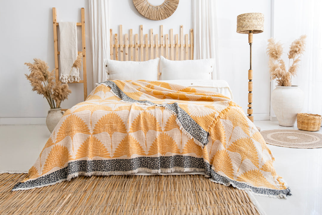 A cozy bedroom with a wooden headboard, white pillows, and the Gingko Muslin Bed Blanket – Teal (King-Oversized Queen) by turkanhome.com. Woven accents, pampas grass, and neutral decor create a calm, airy atmosphere. A cozy bedroom with a wooden headboard, white pillows, the Gingko Muslin Bed Blanket – Teal (King-Oversized Queen) from turkanhome.com, a round wicker mirror, and a wooden floor lamp with matching lampshade.