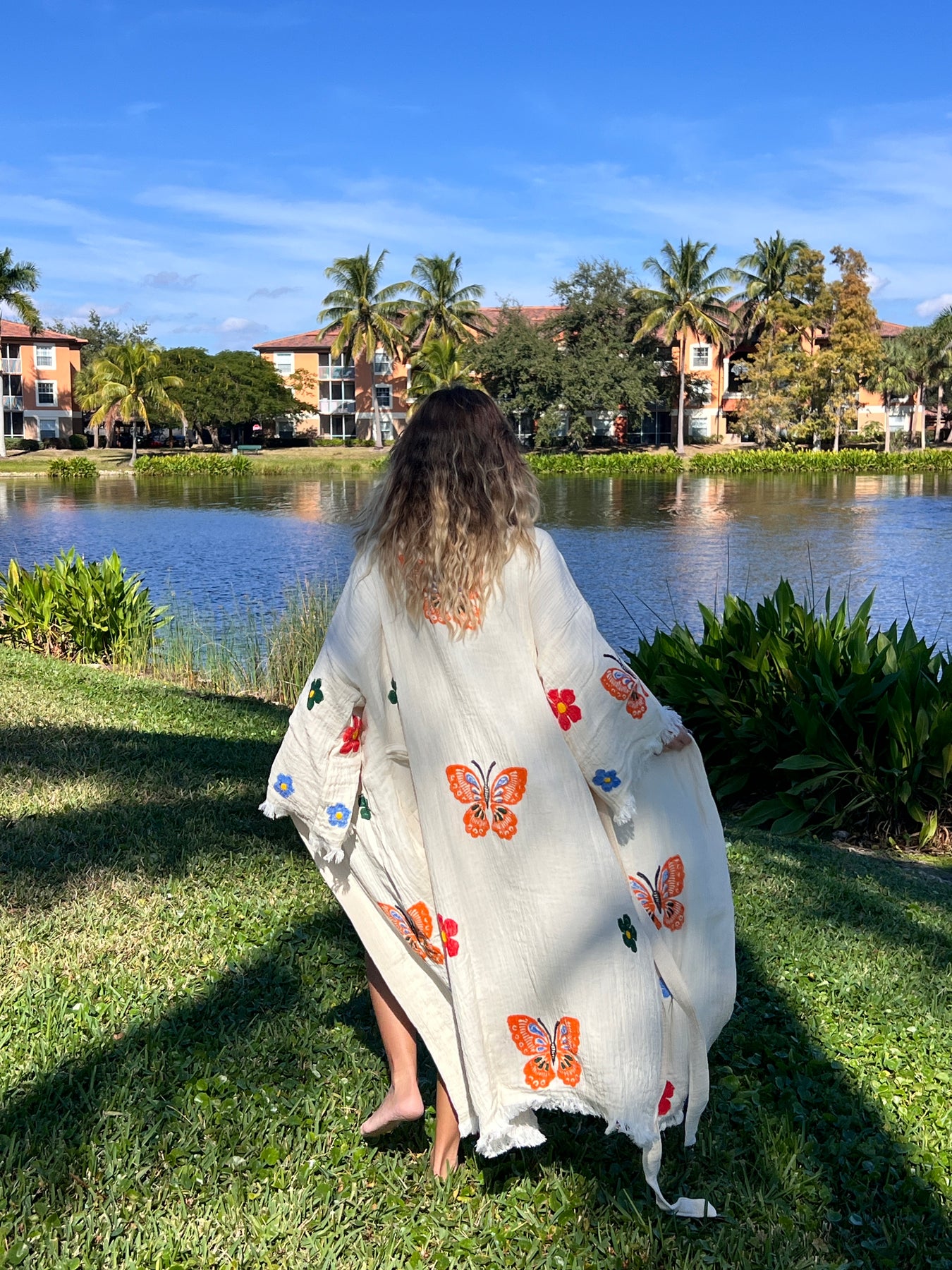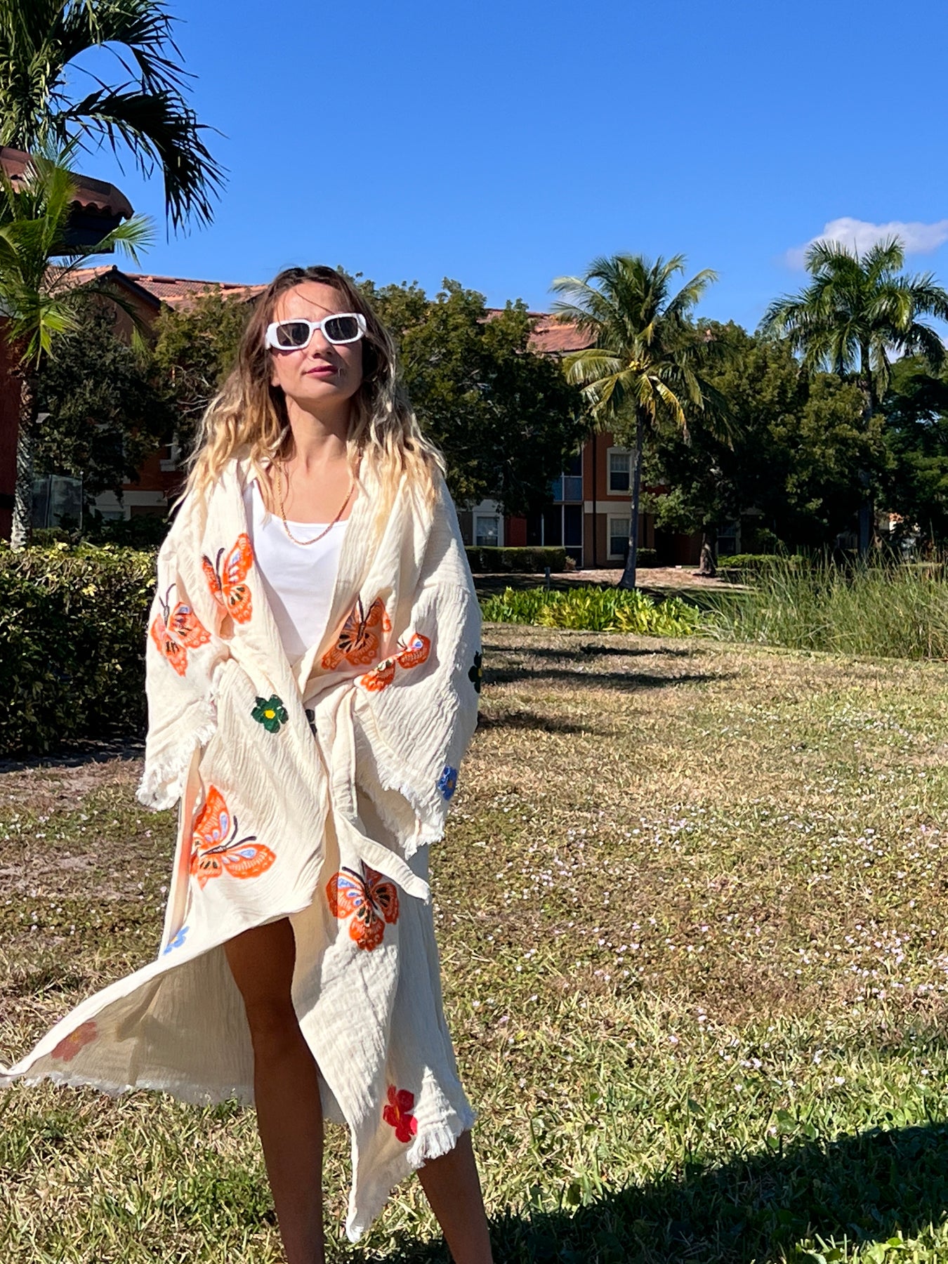 Minimal & Timeless – Hand-Printed Kimono with butterfly design.