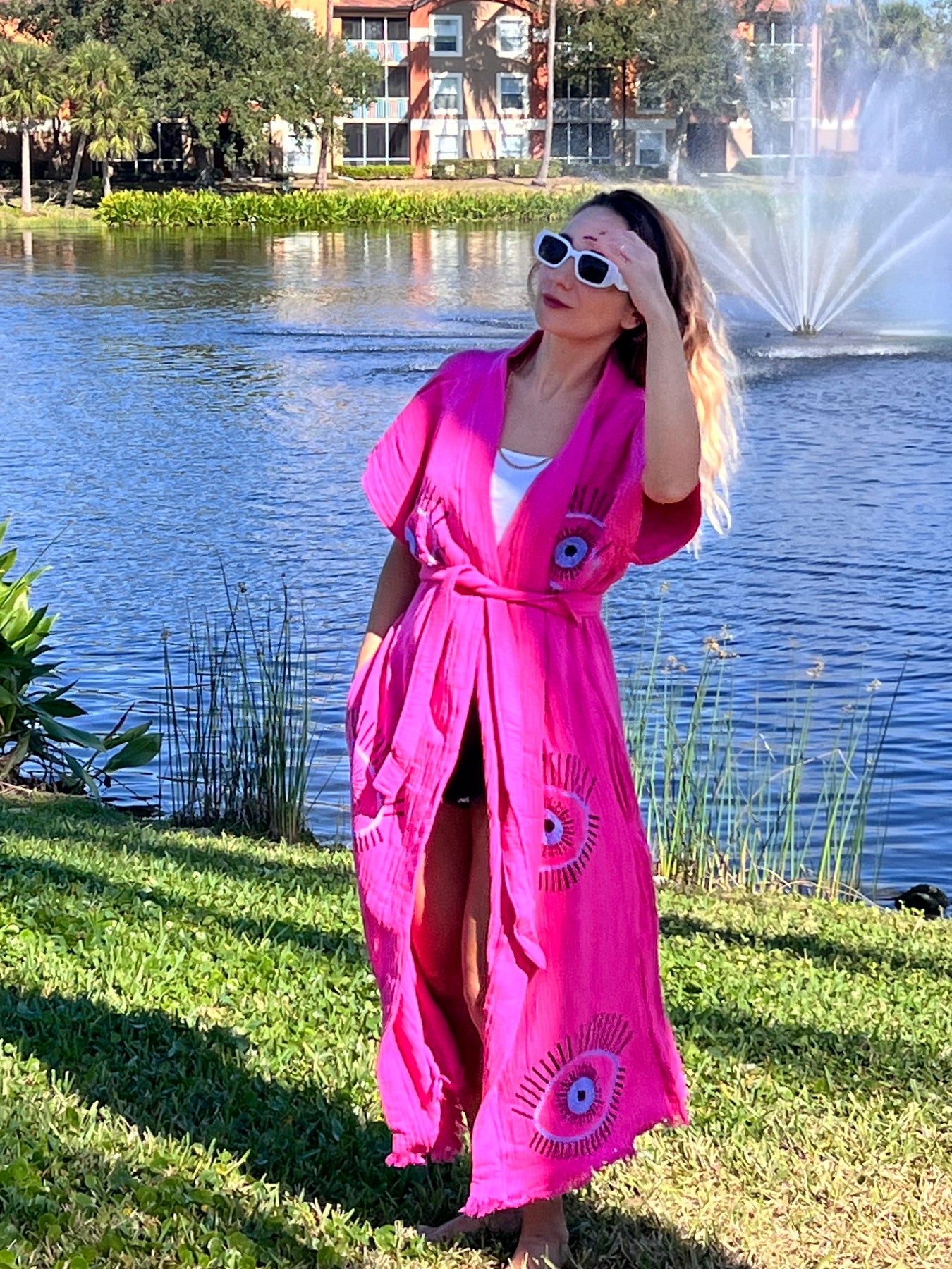 Minimal & Timeless – Hand-Printed Kimono with lucky eye design.