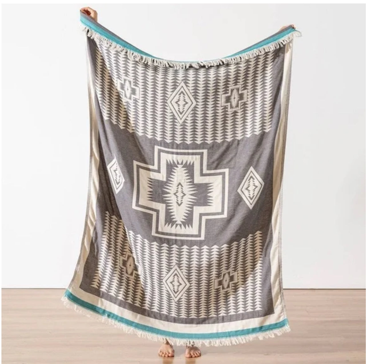 Each throw features a reversible design with eye-catching geometric patterns and colorful borders. Lightweight yet durable, it's a go-to for indoor coziness and outdoor adventures.